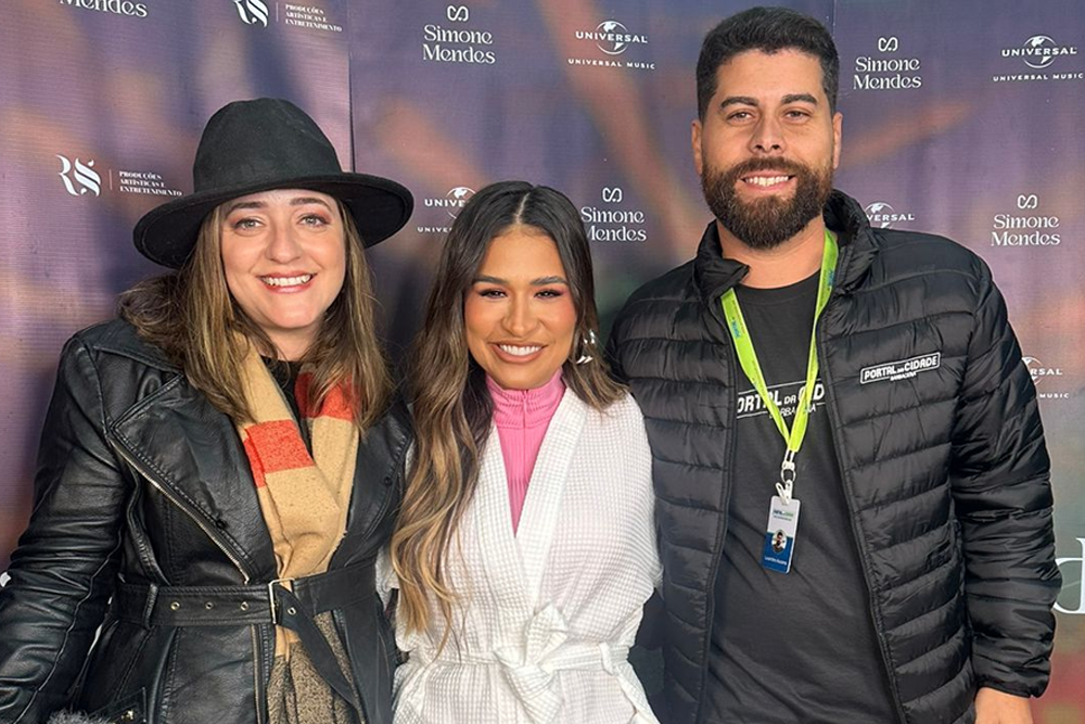 Thaís e Leandro, do Portal da Cidade Barbacena, com a cantora Simone Mendes
